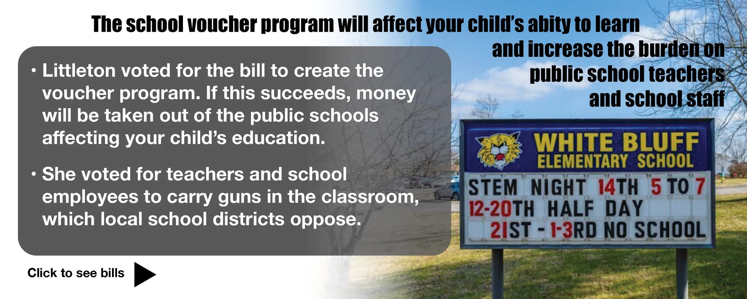 Click on the box to see bills and laws passed and proposed by the majority, including the current representative, that are hurting schools, our environment and our families.