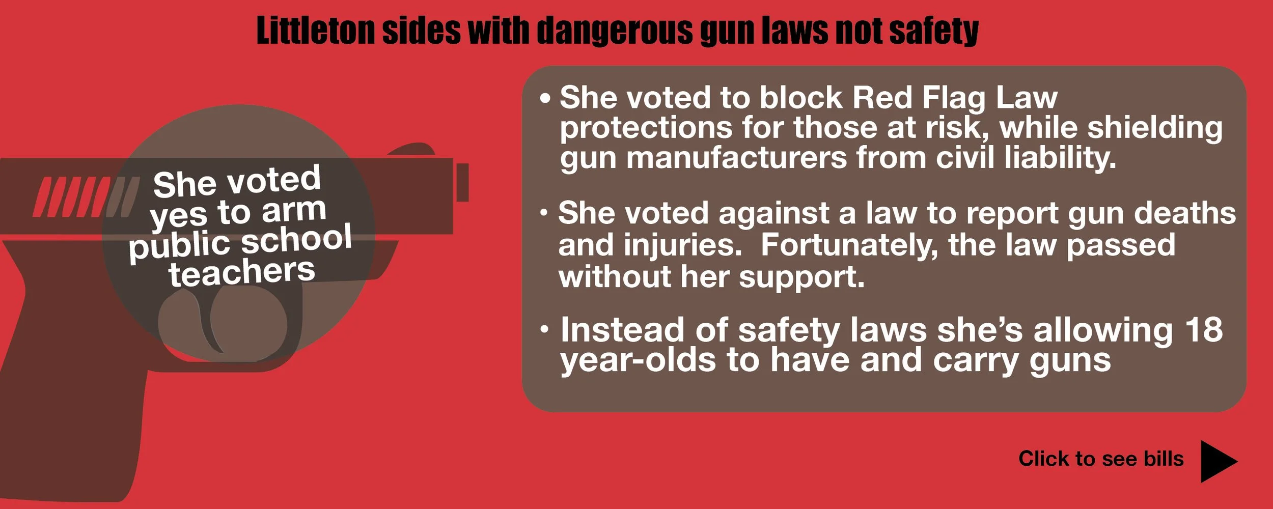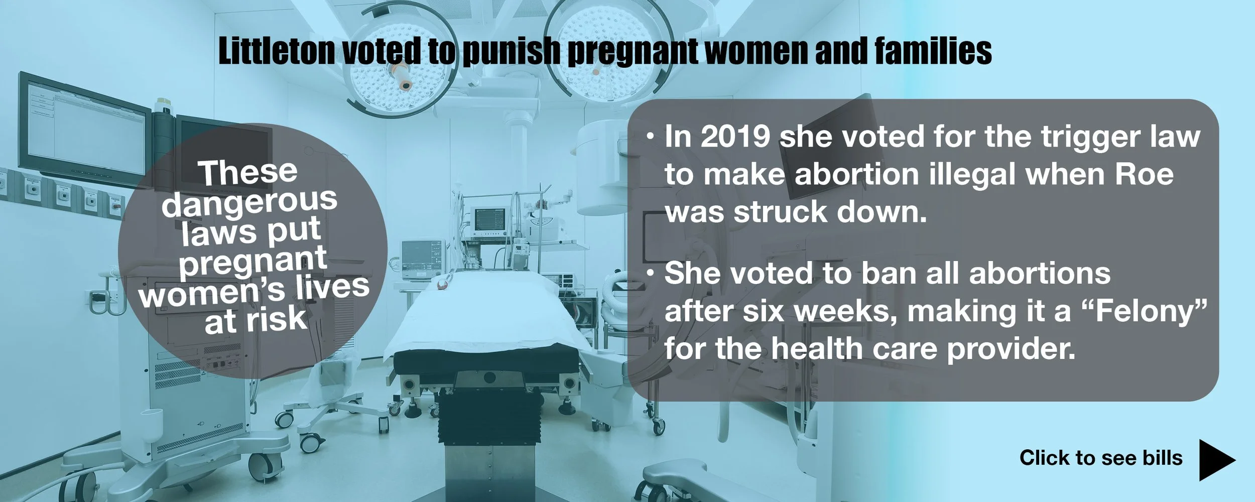 The State is taking away and criminalizing women’s and families’ rights to reproductive freedom and life-saving health care. Men, women and families all deserve to decide their own birth control. We have preeminent healthcare in TN, and all of us deserve to take advantage of that medical expertise when medical issues arise. We need care here. We need it now. And certanily shouldn’t have to go out of our own state. Extremists will not stop with states. They will push for a national reproductive-freedom ban in this election. Littleton voted for the “trigger law” in 2019 that would go into effect after the overturn of “Roe vs Wade” in preparation of the now State-wide ban. (See Bills)