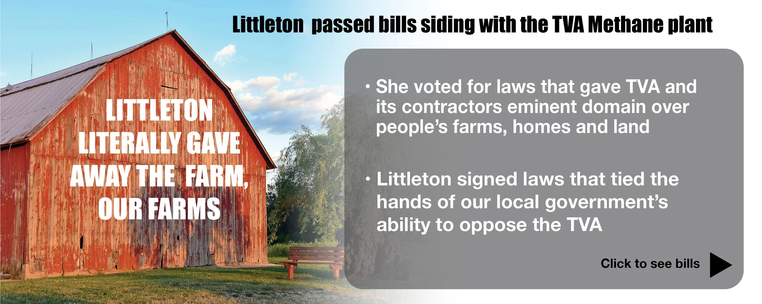 I have attended the town halls, the protests, spoken at the listening sessions, and neighborhood meetings to help strategize how to deliver the biggest impacts to stop this advance of environmental damage from the largest federal power supplier in the nation. Besides not attending any of these sessions, your current Representative Littleton voted to give TVA and it’s suppliers the eminent domain rights to take what they want. (See Bills)